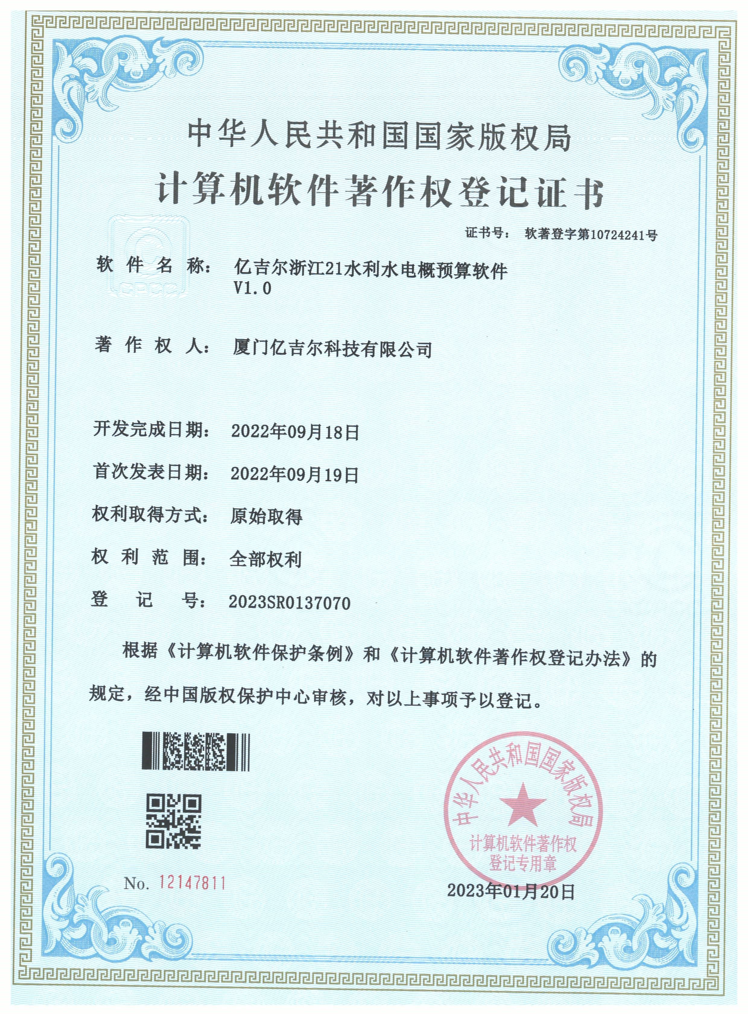 億吉爾浙江21水利水電概算軟件登記證書 發(fā)布日期:2023年11月22日 瀏覽次數(shù):2699 關(guān)鍵字: 公司 1/1億吉爾浙江21水利水電概算軟件登記證書(2022R11L1869444)