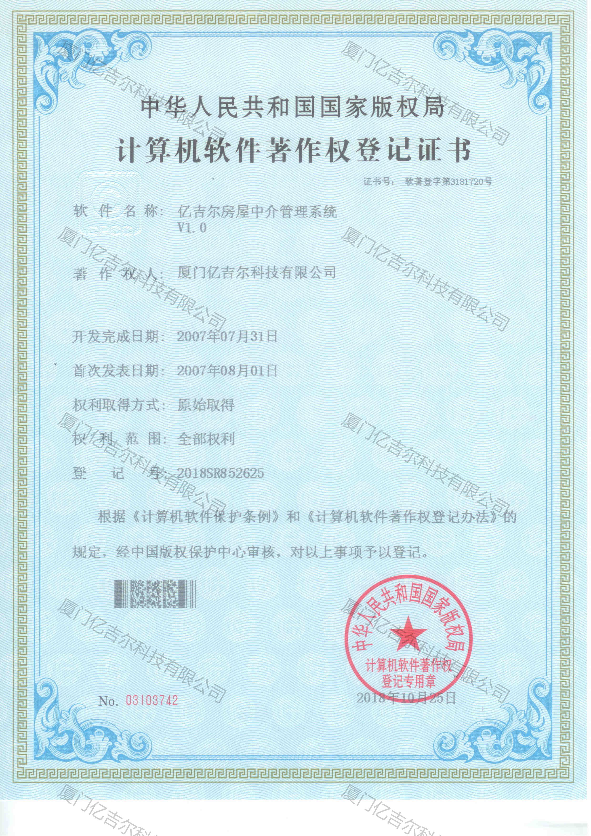 億吉爾房屋中介管理系統(tǒng)軟件著作權(quán)登記證書 發(fā)布日期:2018年10月25日 瀏覽次數(shù):4687 關鍵字: 公司 1/1億吉爾房屋中介管理系統(tǒng)軟件著作權(quán)登記證書