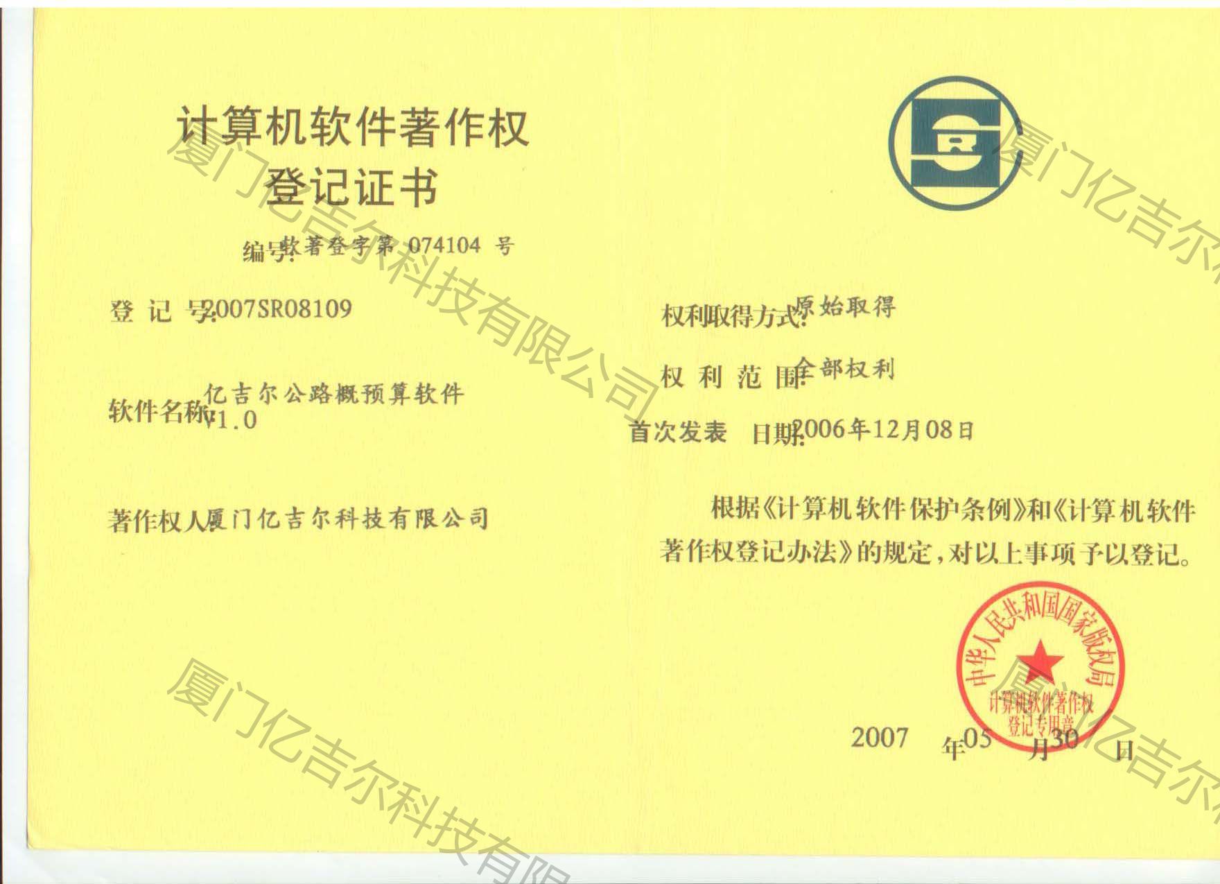 億吉爾公路概預(yù)算軟件著作權(quán)登記證書(shū) 發(fā)布日期:2007年05月30日 瀏覽次數(shù):4217 關(guān)鍵字: 公司 1/1億吉爾公路概預(yù)算軟件著作權(quán)登記證書(shū)