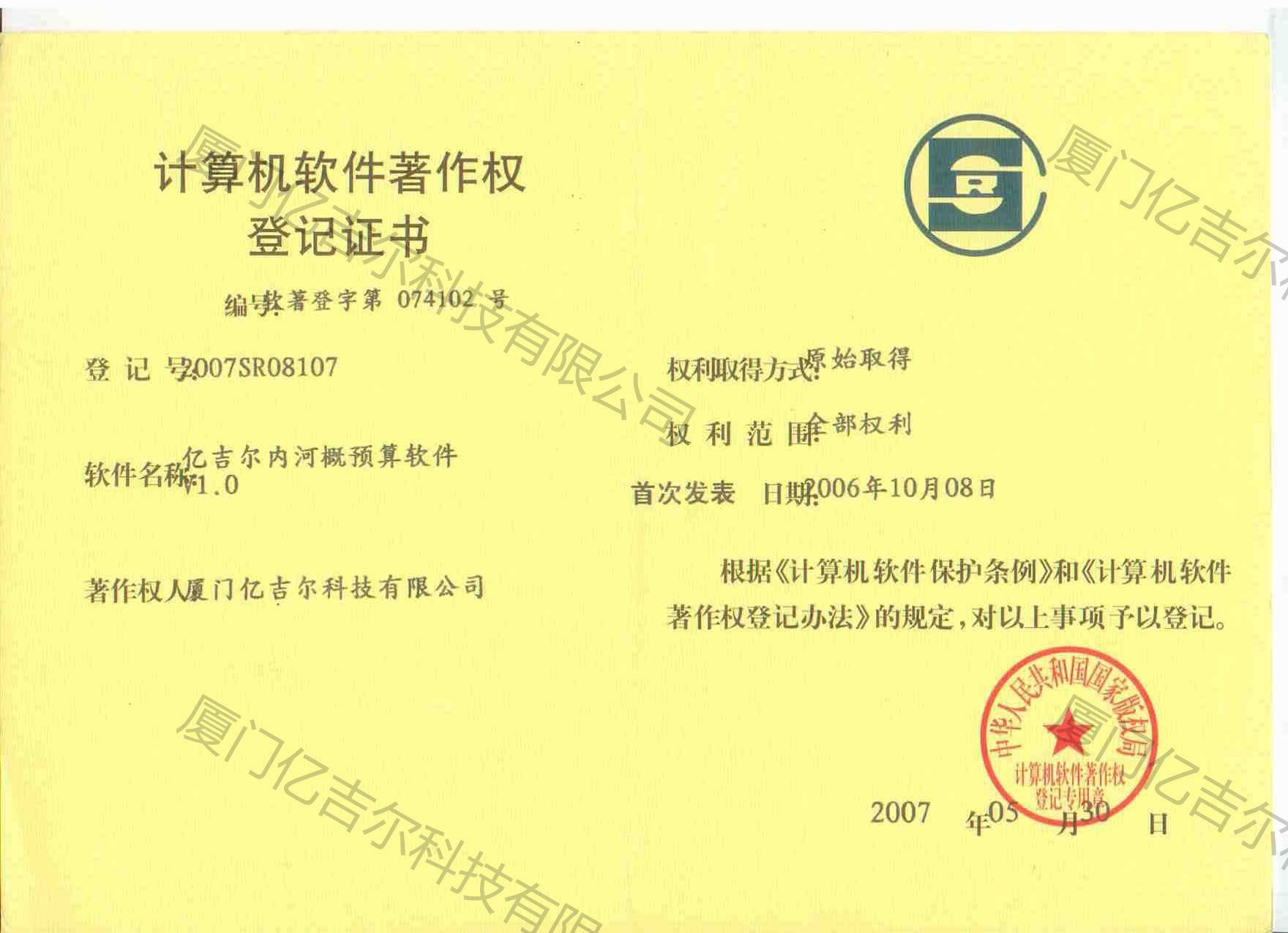 億吉爾內(nèi)河概預(yù)算軟件著作權(quán)登記證書 發(fā)布日期:2007年05月30日 瀏覽次數(shù):4190 關(guān)鍵字: 公司 1/1億吉爾內(nèi)河概預(yù)算軟件著作權(quán)登記證書